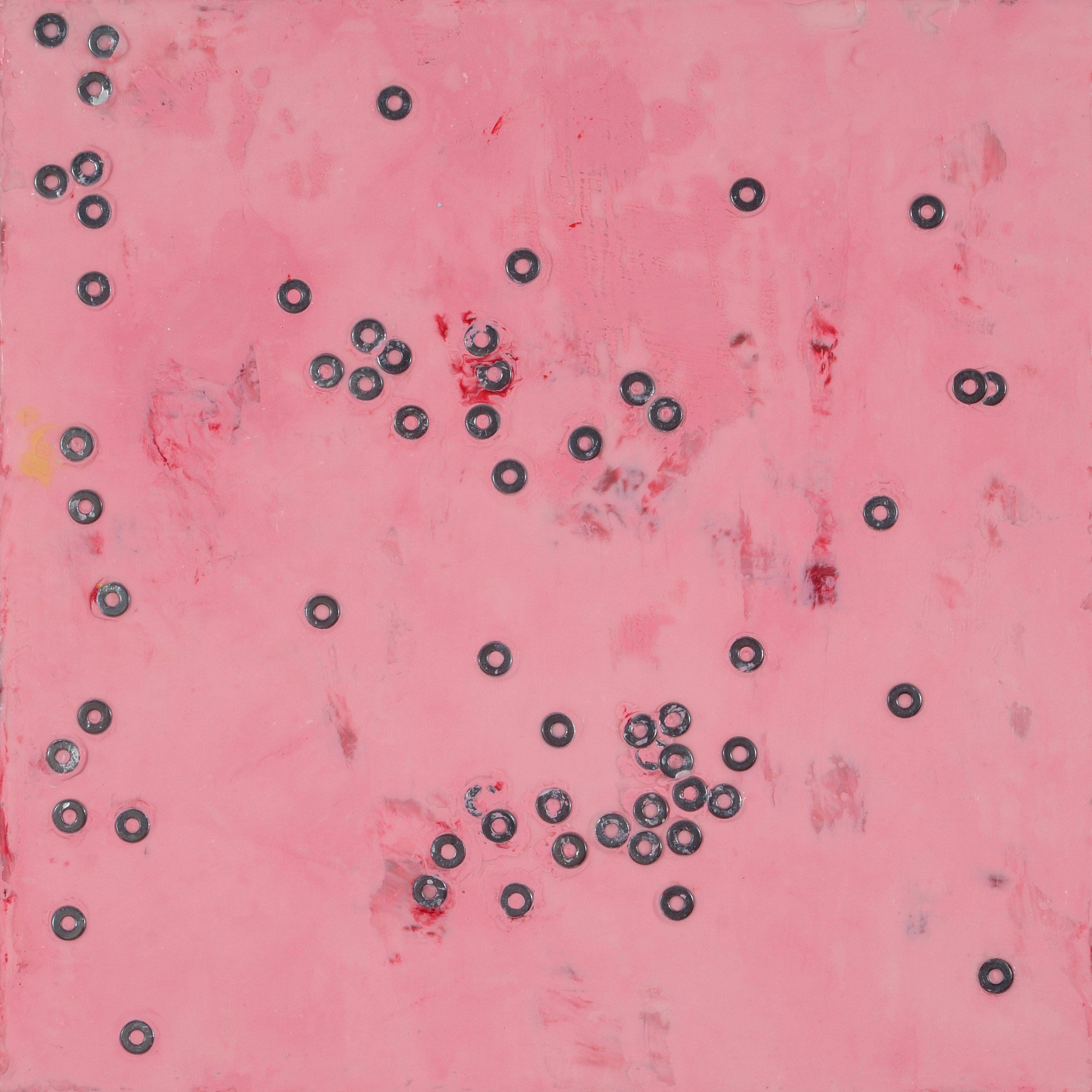 Integrating pieces of metal and other found objects, this series began as a spontaneous expression of frustration. After preparing a smooth surface, I hammered nails into the layers of wax on wood, fostering a sense of control and satisfaction. Softer paint colors with found objects of round metal and soft rubber result from a more peaceful state of mind.